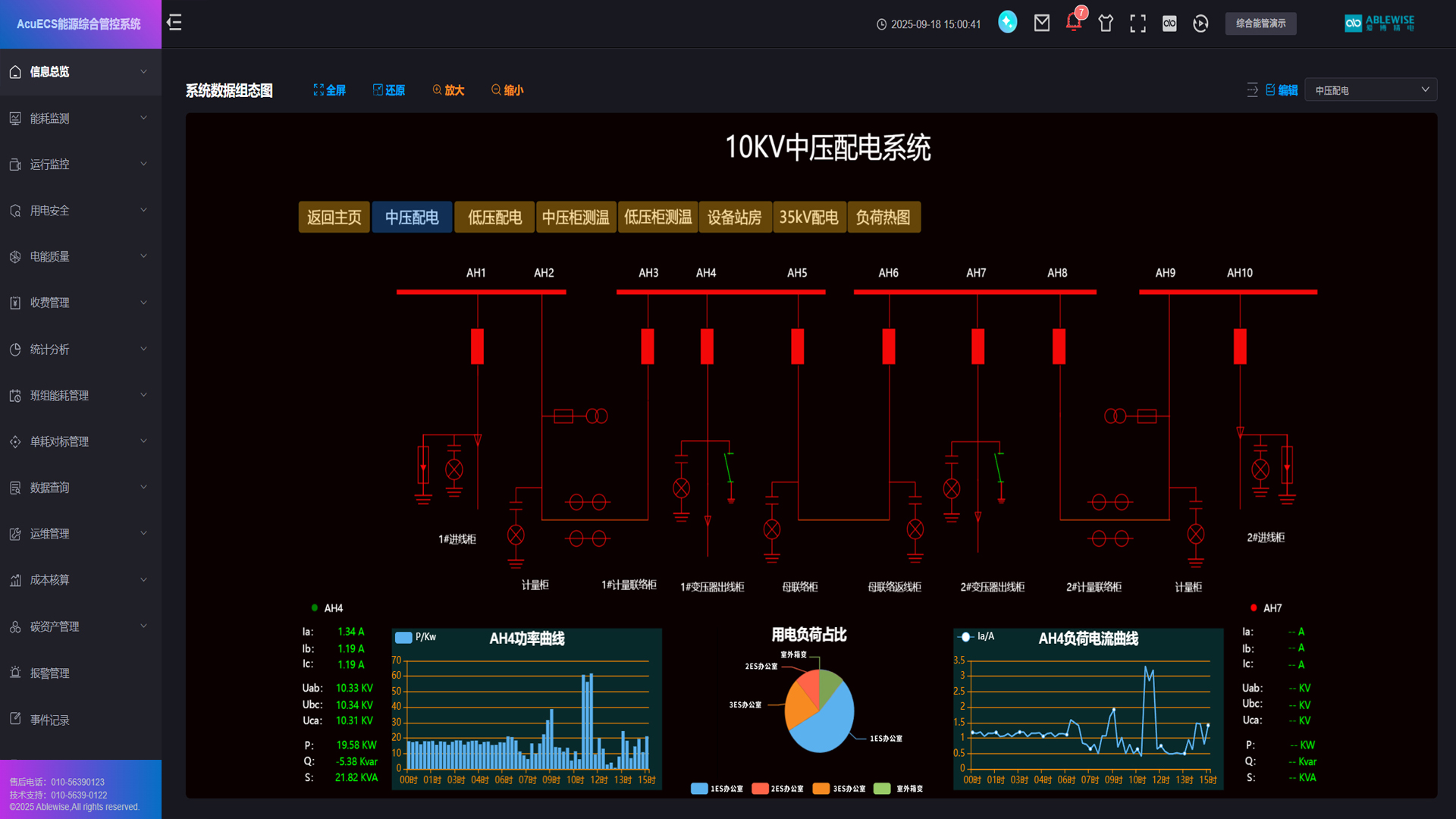 可视化界面:全中文操作界面,以标准电气接线图直观展示实时数据,管理人员可快速掌握各配电室运行状态(含配电容量、变压器及仪表数量等),同时支持日 / 周 / 月 / 年用电量统计分析。