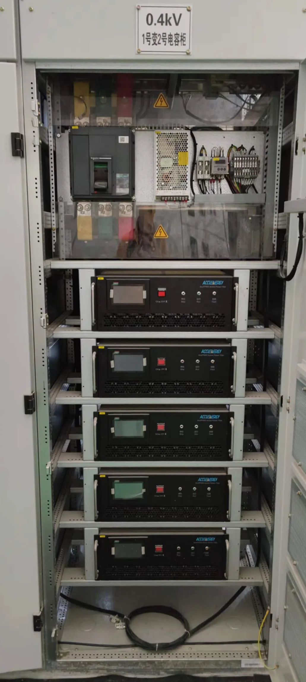 为了降低谐波危害,提高功率因数,有效消除电能质量隐患,业主决定委托爱博精电在配电变压器的低压出线回路安装谐波补偿设备,同时兼有无功补偿功能。根据测算,要达到最佳的治理效果,本项目需要配置7台360Kvar-100A的混合滤波补偿设备。