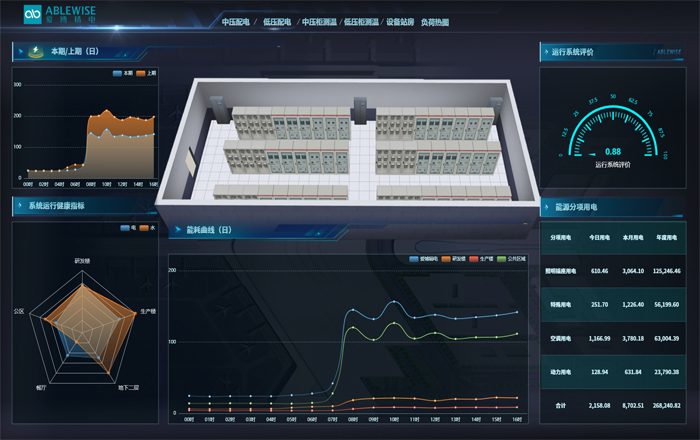 可视化展示各配电室运行概况,包括系统容量、设备数量、运行状态、报警信息及日/周/月/年用电量统计。